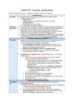 The time taken to compile these notes was over 100 hours. They are colour-coded and simplified for your ease during your exams and include all content covered during the term. These study notes additionally include ALL online module content and caselaw. The following topics are covered: 1. Week 1, Class 1 - Express Terms (I) - Incorporation by signature, Incorporation by notice 2. Week 1, Class 2 - Express Terms (III) - Parol evidence rule, Express terms by statements made 3. Week 2, Class 1 - Construction of Express Terms - Use of extrinsic evidence, Process of construction, Exclusion clauses 4. Week 2, Class 2 - Implied Terms - implied in fact, implied in law, Implied by custom or trade usage 5. Week 3, Class 1 - Termination (I) - Performance, Termination by agreement, Termination by breach of a condition, Termination by breach of an intermediate term 6. Week 3, Class 2 - Termination (II) - Repudiation 7. Week 4, Class 1 - Consequences of affirmation and termination Ready and willing to perform, Election, Estoppel and waive 8. Week 4, Class 2 - Frustration 9. Week 5, Class 1 - Damages (I) - Expectation damages, Direct vs consequential loss, Cost of rectification, Loss of a chance 10. Week 5, Class 2 - Damages (II) - Reliance damages 11. Week 7, Class 1 - Damages (IV) - Limitations on recover of consequential loss, Causation and remoteness, Mitigation 12. Week 7, Class 2 - Damages (V) - Penalties and limits on agreed remedies, Revision of ACL options 13. Week 8 Class 1 | Vitiating factors (I) - Rescission 14. Week 8 Class 2 | Vitiating factors (II) - Misrepresentation 15. Week 9 Class 1 | Misleading or Deceptive Conduct - Misleading or deceptive conduct, Review ACL remedies 16. Week 9 Class 2 | Vitiating Factors (IV) Undue Influence 17. Week 10 Class 1 | Equitable unconscionable dealing & unconscionable conduct under statute, Unconscionable dealing in equity, Unconscionable conduct under statute