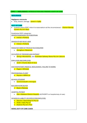 Comprehensive set of Exam Notes for Torts Law. Achieved HD mark as final result. Topics: TOPIC 1 – NEGLIGENCE: INTRODUCTION AND FINDING A DUTY OF CARE TOPIC 2 – STANDARD OF CARE AND BREACH OF DUTY OF CARE TOPIC 3 – NEGLIGENCE: CAUSATION AND SCOPE OF LIABILITY FOR CONSEQUENCES TOPIC 4: DEFENCES TO NEGLIGENCE CLAIMS TOPIC 5: VICARIOUS LIABILITY; NON-DELEGABLE DUTIES; CONCURRENT AND PROPORTIONATE LIABILITY TOPIC 6: LIABILITY FOR MENTAL HARM TOPIC 7 and 8: DAMAGES FOR PERSONAL INJURY TOPIC 9: TRESPASS TO PERSON TOPIC 10 – TRESPASS TO LAND