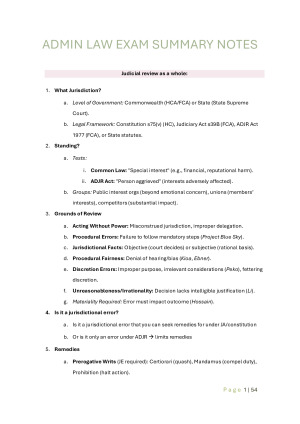 I recieved a mark of 88 in the exam from these notes. These notes are focused on what you need for the final exam – not class or participation. Everything is structured using default Word headings so it’s easy to navigate and change. Covers all examinable topics across the term. Follows a step-by-step problem question format so you can quickly spot legal issues and apply the rules. Includes all key legal rules and important cases (but not full case facts, which aren’t needed for the exam). Notes are clear and to the point – made to help you move quickly in an exam setting. Tips and reminders are written in red/highlighted to help you remember what matters under pressure. Best for students who want a full, ready-to-use guide for the final exam. They cover the whole course: - jurisdiction - standing - all grounds for review - jurisdictional error - remedies - statutory restrictions