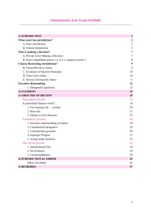 These notes are a complete set of Administrative Law exam scaffolds that helped me achieve a High Distinction in the final exam. They cover all lectures and weeks of content, fully summarised into a clear, structured format that is easy to follow in both study and exam conditions. The notes include step-by-step scaffolds for problem questions and case law summaries, making them an essential resource for revision and exam prep. Topics Covered: 1) JURISDICTION What court has jurisdiction? A. State Jurisdiction B. Federal Jurisdiction Who is making a decision? A. Private Actor Making a Decision B. Non-Compellable power: is it a -statutory power ? Clauses Restricting Jurisdiction? A. Ouster/Privative clause B. Exclusion of Specific Remedies C. Time Limit clause D. Secrecy/information clause Executive Rule making 1. Delegated Legislation Procedural Grounds Is procedural fairness owed? Fair hearing rule – content Bias rule Failure to Give Reasons Substantive grounds Incorrect understanding of statute Unauthorised delegation Consideration grounds Improper Purpose Acting under dictation Decisional grounds Jurisdictional Fact No Evidence Unreasonableness 4) JURISDICTIONAL ERROR Effect: Invalidity 5) REMEDIES