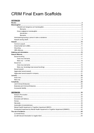 These notes are a complete set of Criminal Law exam scaffolds, covering all examinable offences and defences with clear step-by-step elements,, and case references. They were designed specifically for the problem question portion of the final exam and provide structured frameworks to apply under time pressure.