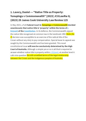 THIS IS NOT THE ESSAY, THIS IS A FULL RESEARCH JOURNALS PACK. The mid-term Research Essay was one of the most demanding assessments in this course – highly academic, logically complex, and conceptually broad. Many students struggled, and some even failed. These materials provide both abstracts and full-text research journals that I used to achieve a High Distinction (88%) in this essay. ✅ Covers Core Themes – pluralist property theory, native title (Yunupingu v Commonwealth 2023 & 2025 HCA), bundle of rights, comparative perspectives (NZ, Canada), and relational conceptions of property  . ✅ Rigorous and Academic – carefully selected journals that are scholarly, credible, and directly relevant to the mid-term question. ✅ Structured for Essay Writing – abstracts highlight the key insights, arguments, and how they fit into different sections of the essay scaffold. ✅ Saves Time & Avoids Pitfalls – helps prevent the common mistakes and misdirected arguments that caused many students to underperform. 💡 Ideal if you want to strengthen your research base, sharpen your arguments, and write with clarity and confidence under strict marking standards.