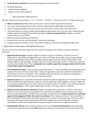 * Thorough, easy-to-follow notes from a high-scoring student 98 HD, ideal if you want to save time and study smarter. Exam focused. All you need to achieve a very easy HD if fully understood. Compiled Notes and Explanations for Weeks 1–12 Table of Contents 1. Week 1 – Estimating the Cost of Capital 2. Week 2 – Capital Structure in Perfect Markets (M&M Proposition I & II) 3. Week 3 – Capital Structure in Perfect Markets (Applications & Fallacies) 4. Week 4 – Capital Structure with Corporate Taxes 5. Week 5 – Financial Distress, Agency Costs, and Information Asymmetry 6. Week 6 – Payout Policy: Dividends and Share Repurchases 7. Week 7 – Mid-Semester Break 8. Week 8 – Project Valuation with Leverage: WACC Method 9. Week 9 – Project Valuation with Leverage: APV Method and Other Policies 10. Week 10 – Mergers and Acquisitions (M&A) Analysis 11. Week 11 – Equity Financing: IPOs and SEOs 12. Week 12 – Course Summary and Review 13. Key Formulas and Conceptual Summary