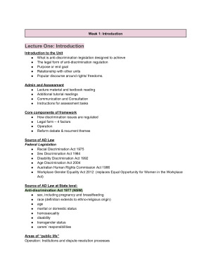 Clear and succinct lecture notes from Discrimination and the Law! Provides a clear and concise snapshot of all the important aspects you need to know in the unit. This is a good resource to base assessment tasks on and can be used as a guide to start your research.