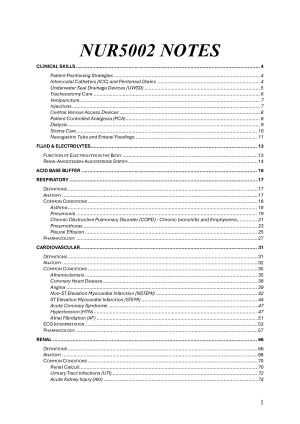 I am a part of the cohort who was the first to go through the brand new MNP curriculum, so these notes are the most up to date available at this moment. I got a 90 overall in NUR5002 and received the highest mark on the essay/case study assignment of my cohort, and a 92 on the exam. I also included information in these notes about grad years since some you will be applying for grad years at the end of your NUR5002 class time and the info provided by Monash THESE NOTES INCLUDE: - Table of contents - Overview of clinical skills - Fluid and electrolyte information - Acid base buffer information - Pathophysiology, risk factors, clinical manifestations, nursing considerations and interventions, and diagnostic information, and pharmacology for the following body systems: -- Cardiac -- Respiratory -- Renal -- Endocrine -- Shock and Trauma -- Musculoskeletal -- Haematology, Vascular and Pain -- Neurological -- Gastrointestinal - Interprofessional collaboration information - Examples of two page exam notes - Exam and course tips - including links to quizlets - Grad year application tips While this is a thorough overview of everything and I did extensive research to fill in the gaps left in the course material, it is not perfect and is not a substitute for the course material and classes themselves. Unfortunately the document was originally to many MB and so I had to compress the PDF file, so I apologise if there was any loss of information or blurry photos as a result of that process. Happy studying <3