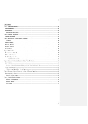 Week 7: Numerical Integration – trapezoidal rule (first-order), Simpson’s rule (second-order), step-size control, adaptive accuracy, and polynomial approximation methods for estimating areas under curves. Week 8: Gaussian Quadrature – integration using weighted sampling points (roots of Legendre polynomials), higher accuracy with fewer evaluations, no need for evenly spaced data; used in FEM and engineering analysis. Week 9: Roots of Non-Linear Equations – graphical, stepping, bisection, Newton–Raphson, and secant methods; error tolerance, convergence behaviour, and MATLAB fzero application. Week 10: Optimization – downhill (search) method, golden-section search, quadratic approximation, and practical example (rocket-launch range). Emphasises finding local vs. global minima and algorithm efficiency. Week 11: Ordinary Differential Equations (Initial-Value Problems) – Euler’s and Runge–Kutta methods, truncation error and adaptive step sizing, error monitoring through step-doubling. Week 12: Boundary-Value Problems & Finite Difference Method – solving ODEs with conditions at multiple points; discretisation into nodes, matrix formulation, examples (pressure vessel, beam deflection, heat transfer); linear vs. non-linear systems, geometric and material non-linearities, iterative convergence.