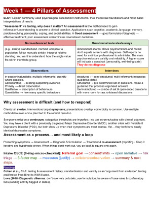 Module 01 Week 1 - Introduction to Assessment Module 02 Week 2 - Clinical Assessment 1 Module 03 Week 3 - Clinical Assessment 2 Module 04 Week 4 - Assessment Guided Intervention: Case Formulation Module 05 Week 5 - Norm-referenced tests 1 - WAIS-IV