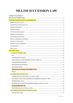 This notes helped me achieve 80% on the end of unit exam with an 84 for the entire unit. The notes were created using only material from the unit and cover the following topics: 1: Intro 2: Wills - Capacity to make a will Formalities to make a will Construction and revocation of wills Gifts in wills 3: Probate and Administration - LPRS and Grants Intestacy Family Provision Claims Administration of Deceased Estates 4: Power of Attorney and Guardianship