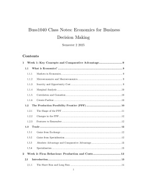 Introductory economic notes covering the first year economics unit for commerce BUSS1040. Topics are organised by week and include: Week 1 - Introduction to Economics Week 2 - Firm Behaviour Week 3 - Supply and Demand Week 4 - Market Equilria and Welfare Week 5 - Introduction to Markets Week 6 - Perfect Competition Week 7 - Monopoly (I) Week 8 - Monopoly (II) Week 9 - Monopolistic Competition Week 10 - Oligopoly and Game Theory: Strategic Interaction and Business Strategy (I) Week 11 - Strategic Interaction and Business Strategy (II) Week 12 - Market Failure and Government Intervention (I) Week 13 - Market Failure and Government Intervention (II)