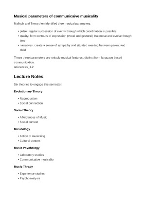 This is a note of mine that covers all 11 weeks of MUSI20150: Music and Health and includes both lecture content and key ideas from associated readings, theories, and case studies. Well suited for organizing notes for weekly quizzes, as well as preparing for the final essay! Topics Covered Week 1: Background Week 2: Music and Physical Health Week 3: Music and Rehabilitation Week 4: Music & Physical Illness Week 5: Music and Mental Illness Week 6: Music and Mental Health Week 7: Music and Social Connection Week 8: Music and Psychoanalysis Week 9: Music and Identity Week 10: Music and Power Week 11: Music and Community Weeks / Lectures Covered All 11 weeks of lectures Includes summaries of lectures by Dr Kat, Dr Lucy, guest podcasts, and case studies