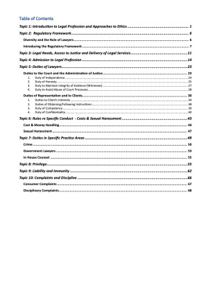 Detailed and Scaffolded Notes used to obtain Distinction in Final Exam. Include legislation + case examples for ALL topics. Topics include: Topic 1: Introduction to Legal Profession and Approaches to Ethics Topic 2: Regulatory Framework Topic 3: Legal Needs, Access to Justice and Delivery of Legal Services Topic 4: Admission to Legal Profession Topic 5: Duties of Lawyers a) Duties to the Court and the Administration of Justice b) Duties of Representation and to Clients Topic 6: Rules re Specific Conduct - Costs & Sexual Harassment Topic 7: Duties in Specific Practice Areas - Crime, Government Lawyers, In House Counsel Topic 8: Privilege Topic 9: Liability and Immunity Topic 10: Complaints and Discipline