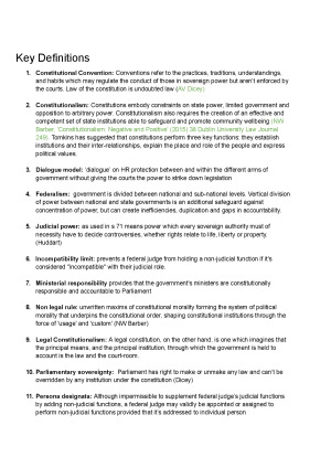 These are extensive and highly detailed notes for the entire LAWS141 Principles of Public Law course. Notes are colour-coded and contain thorough case studies, all legal theorists discussed in the textbook, an exam answer scaffold, and a glossary with key terms. These notes were critical for achieving a Distinction overall mark. Notes are numbered and come with an index for easy navigation in the final exam. Spent over 100 hours curating and perfecting these - thank me later :) Covers all topics assessable in both the mid-term and final exam, including: - Constitutional Hybrid - The Rule of Law - Separation of Powers - The Evolution of the Westminster Constitution: (a) Responsible and representative government (b) Parliamentary sovereignty (c) Constitutional conventions - American Constitutional Inheritance: Federalism, Separation of Powers and Judicial Review - Australian Federalism - Popular Sovereignty - Indigenous and Crown Sovereignty - ATSIs, the Constitution and the Electoral Franchise - Drafting Australian Constitution, 1967 Referendum and Races Power - Statutory Interpretation Exam Scaffold - Principle of Legality - Legislature - Express and Implied Right to Vote - Executive - Judiciary - State Courts and Separation of Judicial Power - Rights Protection - Constitutional Change