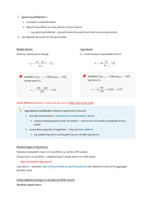 NEW 2025 NOTES – ECMT2130 Premium, high-quality notes compiled directly from lecture slides and key tutorial insights. Clearly structured and easy to follow, with all equations professionally formatted in LaTeX. Includes an exclusive bonus summary outlining key assumptions, statistical tests performed and the purpose of each - ideal for quick revision and exam preparation. Topics are organised to align closely with lectures and tutorials, making them easy to follow along throughout the semester. These notes helped me achieve a near-perfect mid-semester score (28/30) as well as full marks on the EFT and assignment. Hope they can help you excel! Covers topics below: 1. Introduction (returns & compound interest) 2. Probability and statistics for finance 3. Conditional expectation, covariance & basic portfolio theory 4. Empirical analysis of CAPM 5. Linear predictive regression 6. Inference in linear predictive regression 7. (midsem week) - no lecture 8. Testing joint hypothesis & robust inference 9. Robust inference & stochastic regressor 10. Stochastic regressors 2 & time series basics 11. Time series prediction and inference 12. Other topics on financial econometrics (volatility models, VaR)