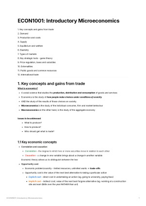 High-quality ECON1001 Introductory Microeconomics notes covering the entire semester, compiled from lecture slides, key tutorial content and allocated readings. These notes helped me achieve a high distinction mark of 89 - I hope they can help you too! If you like these, check out my ECON1002 Introductory Macroeconomics notes as well (received a final mark of 91): - Super helpful if you choose to complete both intro courses in the same sem as I did :) What’s included: - Full coverage of Introductory Microeconomics (ECON1001) topics - Clear explanations of core microeconomic concepts and intuition - Diagrams and models explained step-by-step - Cleanly formatted equations (LaTeX) Perfect for: - Keeping up with weekly content - Mid-semester consolidation - Final exam revision and quick refreshers Covers topics below: 1. Key concepts and gains from trade 2. Demand 3. Production and costs 4. Supply 5. Equilibrium and welfare 6. Elasticity 7. Types of markets 8. Key strategic tools - game theory 9. Price regulation, taxes and subsidies 10. Externalities 11. Public goods and common resources 12. International trade