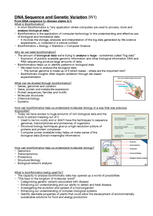 Comprehensive notes covering weeks 1-12, summarising all key content from lectures in a concise and organised manner. Used by many students for HD marks. Topics: - DNA Sequence and Genetic Variation (W1) - Genetic Variation and Disease (W2) - Gene Function and Human Disease (W3) - Genomic Variation and Gene Expression Control (W4) - RNA and Transcriptomics (W5) - Gene Expression Profile and Transcriptomics in Disease (W6) - Proteomics (W7) - Post-translational Modification Profile and Sequence (W8) - Protein Structure Function (W9) - Ligands, Domains and Dynamics in Protein Function (W10) - Protein Regulation via PTM and Drug Therapeutics (W11) - Drug Design (W12)