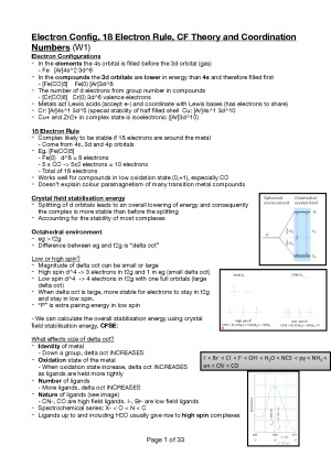 Comprehensive notes covering weeks 1-12, summarising all key content from lectures in a concise and organised manner. Used by many students for HD marks. Topics: - Electron Config, 18 Electron Rule, CF Theory and Coordination Numbers (W1) - Jahn Teller, Macrocylic Effect and Ligand Field Theory (W2) - Formation constants, Irving Williams and Electrode Pot. (W3) - Organometallic Chemistry (W4) - Pi-Complexes (W5) - Sigma-Complexes (W6) - Hybdridisation (W7) - Mechanisms, Sn and E reactions (W8) - Electrophilic Addition to Alkenes (W9) - Carbonyl Chemistry (W10) - Oxidation (W11) - Reactions at the alpha-carbon (W12)