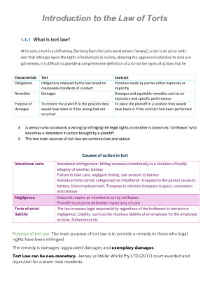 Torts- yes, it is as tough as they all say! I performed well (HD) an I actually liked Torts (LAW1126), and these notes are clear, well-structured, and comprehensive, covering all content required for effective exam revision. As a high school Legal Studies teacher currently studying my LLB, I am experienced in producing clear, exam-focused revision materials. I am also a paid peer advisor at a Uni. *The Case directory is 11 pages alone- every case you will ever need in this course ** The exam prep section is very, very thorough- it will guide you through the bruising 3 hours online exam. Torts can be a challenging course for many students. All images used are free-use or AI-generated Topics Negligence, including defences A representative range of torts (other than negligence) and their defences Damages Concurrent liability Compensation schemes
