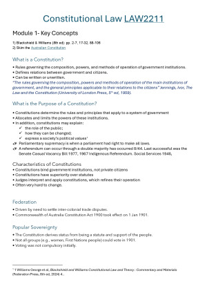 I don't think I have ever met anyone who liked studying Constitutional Law! (LAW2211). You have to do it, I achieved a HD but it was not my fave. These notes are clear, well-organised, and cover all examinable content in an exam-focused format. As a high school Legal Studies teacher studying my LLB, I am experienced in producing effective revision notes. My lecturer was great - its just a dry subject. Exam Prep section included- will guide you through the exam. All images used are free-use or AI-generated. Topics 1. State constitutions and constitutional systems 2. The Commonwealth Constitution and constitutional system 3. The constitution and operation of the legislature, executive and judiciary 4. The relationship between the different institutions of government and the separation of powers 5. The relationship between the different levels of government