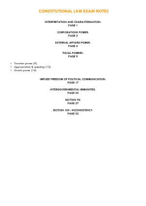 High Distinction exam notes 2025 Covers all exam topics (including potential essay topics) and is in attack-plan form. Note: sample pages selected at random 1. INTERPRETATION AND CHARACTERISATION 2. CORPORATIONS POWER 3. EXTERNAL AFFAIRS POWER 4. FISCAL POWERS: • Taxation power • Appropriation & spending • Grants power 5. IMPLIED FREEDOM OF POLITICAL COMMUNICATION 6. INTERGOVERNMENTAL IMMUNITIES 7. SECTION 92 8. SECTION 109 - INCONSISTENCY 9. EXAM ESSAY PLANS