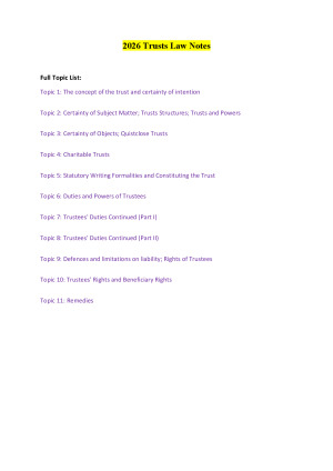 These comprehensive Trusts Law notes (which are HD proven on assessments) cover all topics assessed in the mid-semester assessment AND the exam. With over 140 pages, they are meticulously detailed and have been curated by synthesizing a wide array of authoritative resources, including the course textbook, LSS Sketch Notes, class PowerPoint presentations, Seminar Slides, and most importantly the author's own personal notes from attending lectures and tutorials. The notes not only cover all examinable content but also assist with the structure and answering of questions. The notes are designed to be the ultimate one-stop resource for Trusts, a tool I deeply wished for during my own studies of this unit. Now, you have the opportunity to benefit from hundreds of hours of my meticulous work, all available for a small fee. Topic List: Topic 1: The concept of the trust and certainty of intention Topic 2: Certainty of Subject Matter; Trusts Structures; Trusts and Powers Topic 3: Certainty of Objects; Quistclose Trusts Topic 4: Charitable Trusts Topic 5: Statutory Writing Formalities and Constituting the Trust Topic 6: Duties and Powers of Trustees Topic 7: Trustees' Duties Continued (Part I) Topic 8: Trustees' Duties Continued (Part II) Topic 9: Defences and limitations on liability; Rights of Trustees Topic 10: Trustees' Rights and Beneficiary Rights Topic 11: Remedies