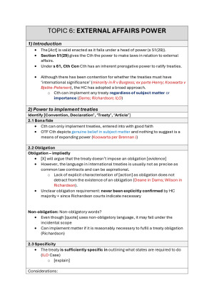 These notes helped me earn a HD in the written assessment and excel at Consti!! These concise notes will help you ace the unit, with easy to follow templates, which provide you with a script, steps to apply the tests, and detailed case examples for each topic. (Cases are in red to help you quickly cite them) Topics: - External Affairs - Financial Powers - Inter-Governmental Immunities - Judicial Powers - Freedom of Political Communication - Freedom of Interstate Trade & Commerce - Inconsistency s 109