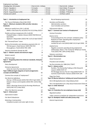 My concise exam notes that got me a H1 (65/80) in Employment Law Sem 2 2025 - final exam Topics covered: Introduction to employment law Minimum standards Modern awards Bargaining and enterprise agreements Work arrangements Enforcement Common law Discrimination law Adverse Action Abusive behaviour Bullying and sexual harassment Unfair dismissal Protections for non-employees Workplace health and safety Essay notes Set out in tables for easy and quick referencing, relevant statute extracts included as well. Last few pages include ideas for essays including prompts from previous exams