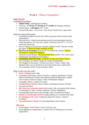 Very thorough GOVT1105 Geopolitics lecture note summaries. All 2 hour lectures attended. Includes important guest lecture notes for the final exam.