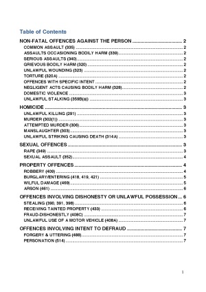 (7 pages) Full summary of the elements for each criminal offence including Criminal Code section & penalty/punishment. Easy to use and saves you time in the exam. See sample for table of contents.