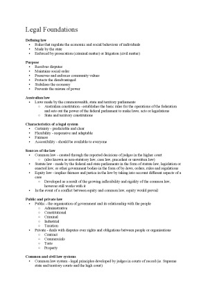 Combined summaries of both lectures 1-13, and the textbook (Business Law BUSL250 compiled by Dr Verity Greenwood and Julian Dight, 3rd Edition), including the topics: Legal Foundations Legal Systems Contracts Torts Tort of Negligence Applications of Negligence to Business Other Business-Related Torts Agency Consumer Protection Consumer Guarantees Property Law Intellectual Property