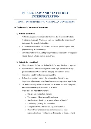Complete and detailed LAW5004 notes according to unit guide. Cases and case studies included. Topic 1: Introduction to the Australian Government Topic 2: Parliament Topic 3: The Executive Topic 4: The Judiciary Topic 5: Statutory Interpretation