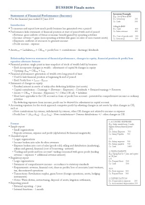 Entire course notes, summarised from the lectures, tutorials and the textbook. These are the notes to get if you want to know what the most important topics are that you're tested on. Well set out, clear and most importantly, concise! Contains: Statement of Financial Performance (Income) Statement of Cash Flows Financial statement analysis (decimals) Management accounting Cost behaviour and cost volume profit analysis Costing Budgeting