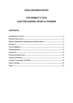 Comprehensive notes for UTS 27628 (Law for Leisure, Sport & Tourism)