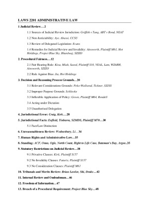 Contains very detailed notes on cases including dissenting judgements on the ADJR Act, s75(v) and common law grounds of review including procedural fairness (inc Kioa v West, Miah, Plaintiff S10, WZARH and more), relevant considerations (Peko-Wallsend, Tickner v Chapman), jurisdictional fact, improper purpose, unreasonableness review. Also includes notes on privative clauses and no invalidity/no considerations clauses with notes on cases like Kirk and Plaintiff S157 as well as Project Blue Sky. Notes on tribunals and merits review (Brian Lawlor Case, Shi and Drake) also included.