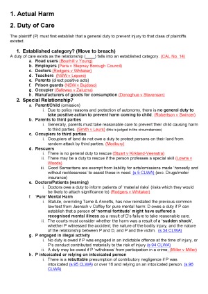 Highly condensed summary of Negligence and step-by-step guide for use in the exam. Includes all cases an example sentences for possible elements of a claim.
