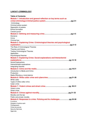 Module 1: Introduction and general reflection on key terms such as crime/criminology/criminal justice system Module 2: Defining and measuring crime Study Module 3: Explaining Crime: Criminological theories and psychological explanations Module 4: Explaining Crime: Social explanations and Interactionist explanations Module 5: Crime and the media Module 6: White collar crime and cyber crime Module 7: Violent crimes and street crime Attention: No on-campus lecture due to public holiday Module 8: Crimes against morality Module 9: Responses to crime: Policing and its challenges Module 10: Responses to crime: The Criminal Courts Module 11: Responses to Crime: Corrections Module 12: Responses to Crime: Victims and Restorative Justice