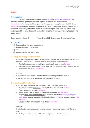 - A concise set of final exam notes. - Clear step-by-step guide to answering problem questions. - 39 pages of full colour - Topics include: Larceny Fraud Common Assault Aggravated Assault Sexual Assault Extending Criminal Liability (Attempt, Complicity, Doctrine of Innocent Agency, Joint Criminal Enterprise, Doctrine of Common Purpose, Withdrawal) Defences (Intoxication, Mental Illness, Necessity)