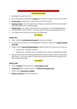 These LAW00520 notes are short & sweet to help with revise for your exam. The topics have been condensed even further and summarised so you can try & remember the important parts of the theories & theorists for the exam Contents: Describe the main elements of classical common law theory Describe the critical legal studies movement What are the concerns of critical race theory? What are the main ethical approaches underpinning the anglo-australian legal system? Outline the main feminist legal theories Describe the law & economics movement & its theorists Briefly describe the main features & limitations of liberalism Outline the main lineaments of the marxist legal theory Identify, describe & evaluate the main classical & contemporary natural law theories What are the main concerns & perspectives of postmodern jurisprudence? Describe and evaluate legal positivism & identify its main theorists & theories Identify the main concerns of sociological, historical and anthropological jurisprudence