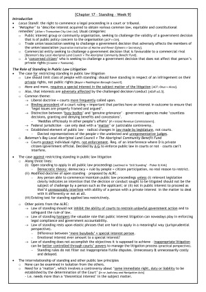 Very comprehensive Contains: Chapter 1 – Administrative Law Introduction – Week 2] Chapter 5 – The Constitutional Framework – Week 2 Chapter 3 – Merit Review & Administrative Tribunals – Week 3] Chapter 6 – Rule-Making & Control of Subordinate Legislation – Week 4 Chapter 4 – Other Methods of Ministrative Law Review – Week 5 Chapter 18 – Access to Information – Week 6 Chapter 2 – The Framework for Judicial Review – Week 8] Chapter 17 – Standing – Week 9] Chapter 8 – Unauthorised Decision-Making – Week 10 Chapter 9 – Legislative Scope and Purpose – Week 11 Chapter 14 – Wednesbury Unreasonableness, Good Administration and the Outer Limits of Legality – Week 12 Chapter 10 – Natural Justice – Week 12