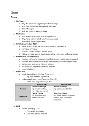These MGMT20001 notes includes summary and revision of both lecture notes and case study. Macro topics include: Change, Culture, Power, Strategy& structure. Cases include: Apple, Enron, Solaris, Sanrizz.