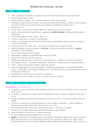 This document contains brilliantly detailed and insightful notes for ATS1365 taken from directly attending each lecture throughout the semester. Notes were made not only on each week's powerpoint, but also lecturer's thoughts, comments and suggestions. Document is laid out in terms of weekly topics (Week 1 - 12), and is presented clearly with key notations, theories and words highlighted, as well as the addition of helpful diagrams to illustrate underlying points.. The end of the document also includes exam tip notes from tutor, useful resources for referenecing, how to write sociological essays and more! So incredibly useful!