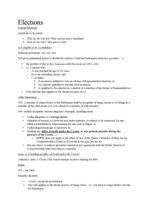 The set of exam notes I took into the exam with me; a fairly comprehensive outline of everything you need to know for the LAWS1205 Australian Public Law exam. I got a solid distinction on the exam despite not understanding what 'non-partisan' means p.s. let me know if you have any question about my notes/the course material - I'm more than happy to help