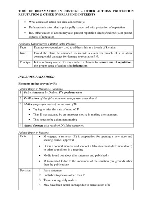 These notes are very extensive and draw from the readings and lectures Main topics: - Introduction - Tort of defamation in context - Preliminary issues - Liability for defamation - Defences - Remedies - Privacy, breach of confidence Suitable for LAWS3428 and LAWS5128 (same content)