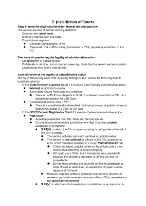 The note provides detailed account of all the materials covered in LAWS5010 Administrative Law. Organised using easy-to-follow headings and sub-headings. This is the only resource you'll need for the exam. Covers: 1. Merits Review 2. Jurisdiction of Courts 3. Public/Private distinctions 4. Judicial review remedies 5. Standing 6. Judicial review of rule making 7. Procedural Fairness (jurisdictional error) 8. Procedural grounds: breach of statutory procedures 9. Reasoning process grounds 10. Decisional grounds 11. Privative Clauses