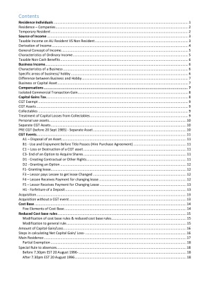 This summary is compiled from the lecture notes and from me coming to class and actually listening to the lecture. It is fully formatted with headings, table of contents, and page numbers. Some of the important parts are highlighted. This summary includes summaries for all chapters and is separated into 2 parts in the file. Part A - Residence to CGT (around 20+ pages) -> this part is very usefull for MCQ Test. Part B - Deductions - Company (around 30+ pages) Bring this to class! I suggest you print this instead of the lecture notes. This summary is super useful for final exam.
