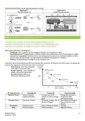 Will get you through semester and exam - great results achieved! - organised format - covers all exam topics Week 4, 5, 6, 7 NOT included Contains: Week 1: Introduction To Business Intelligence Week 2: Managing Data Quality Week 3: Data Warehousing – The Business Perspective Week 8: Data, Text And Web Mining & Web And Social Analytics Week 9: Enterprise Business Intelligence I Week 10: Enterprise Business Intelligence Ii & Business Process Management Week 11: Business Performance Management
