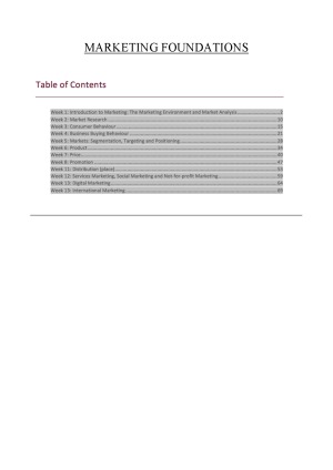 Obtained HDs in all assessments using these notes. Comprehensive Marketing Foundations notes taken from the textbook and lecture slides. Essential for ALL assessments (in class quizzes, group project and exam). NB: Week 9, 10 missing because of StuVac - However, every topic is covered