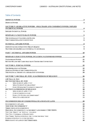 All examinable and non-examinable topics. Detailed Contents Page: --> Pages 3-34 = ACL NOTES --> 34-150 = Constitutional Law Templates Great for Characterisation (Problem Questions)