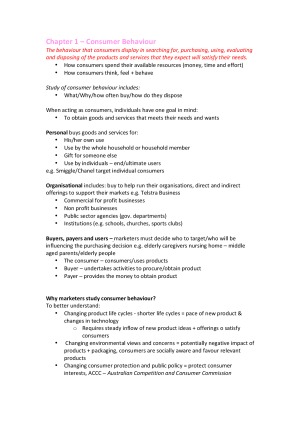 Received an HD in Consumer Behaviour. These notes are concisely detailed with bullet notes and chapter headings. They are formatted simply and are in the order of material covered in class.