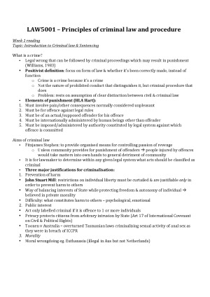 These notes include comprehensive case descriptions, legislation, examples, exam structure and hints for Criminal Law at a post-grad or undergrad level, for the following crimes and their defences: assault, murder, involuntary manslaughter, rape, sexual assault, theft, OPD, OFAD, robbery, burglary, attempts and also criminal procedure