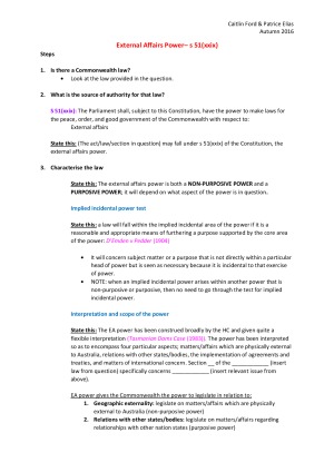 An easy to follow, step-by-step guide to answering final exam problem questions. Topics include: Defence Power External Affairs Power Trade & Commerce Power Race Power Judicial Power Nationhood Power Trial by Jury Implied Freedom of Political Communication Inconsistency of Laws